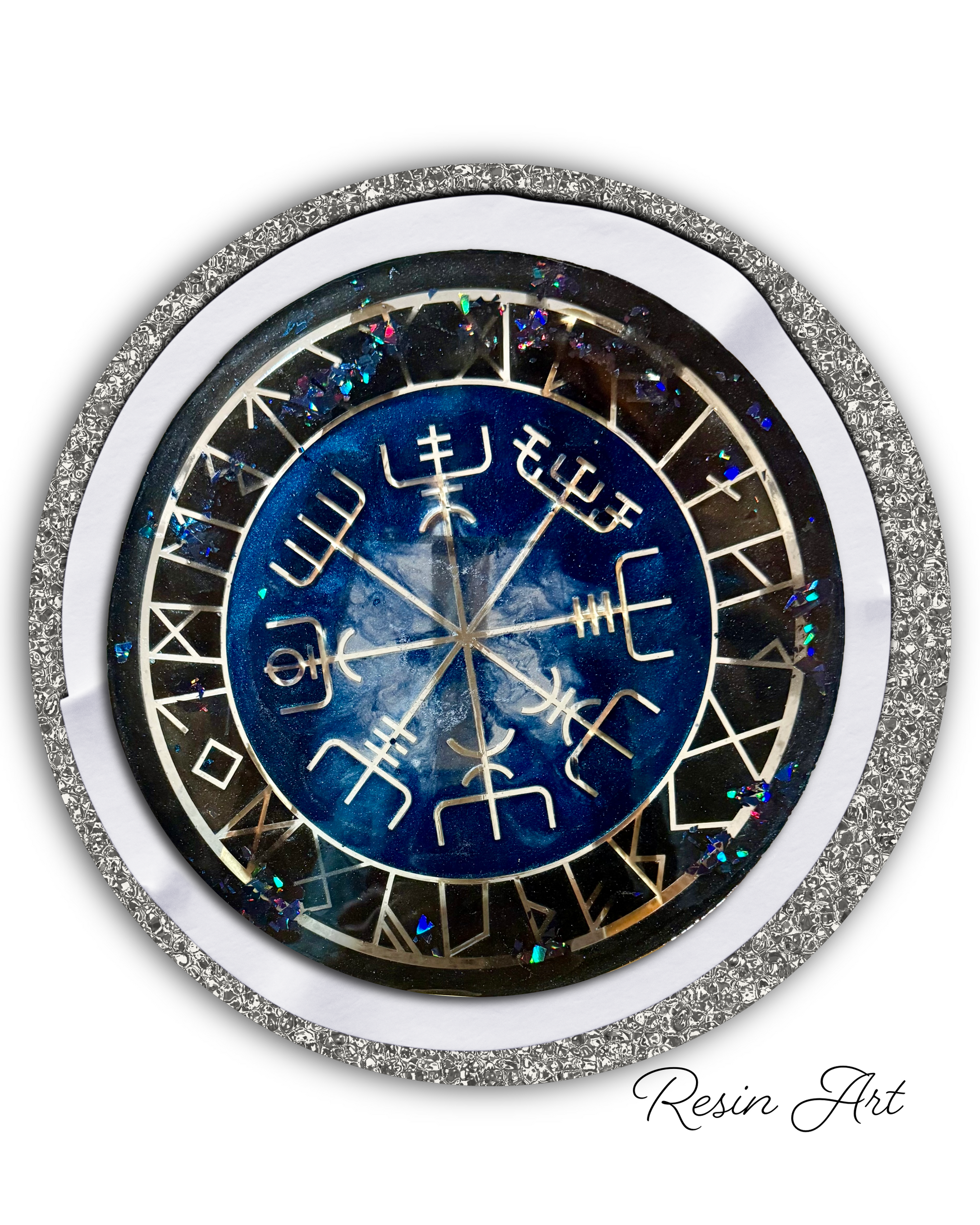 Step into the mystic stillness of the North with Bluehold, a one-of-a-kind handmade resin piece steeped in celestial blue tones and framed with shimmering silver. Measuring approximately 23 cm, its rune-like symmetry and starlit palette evoke ancient fortitude and sacred quiet.